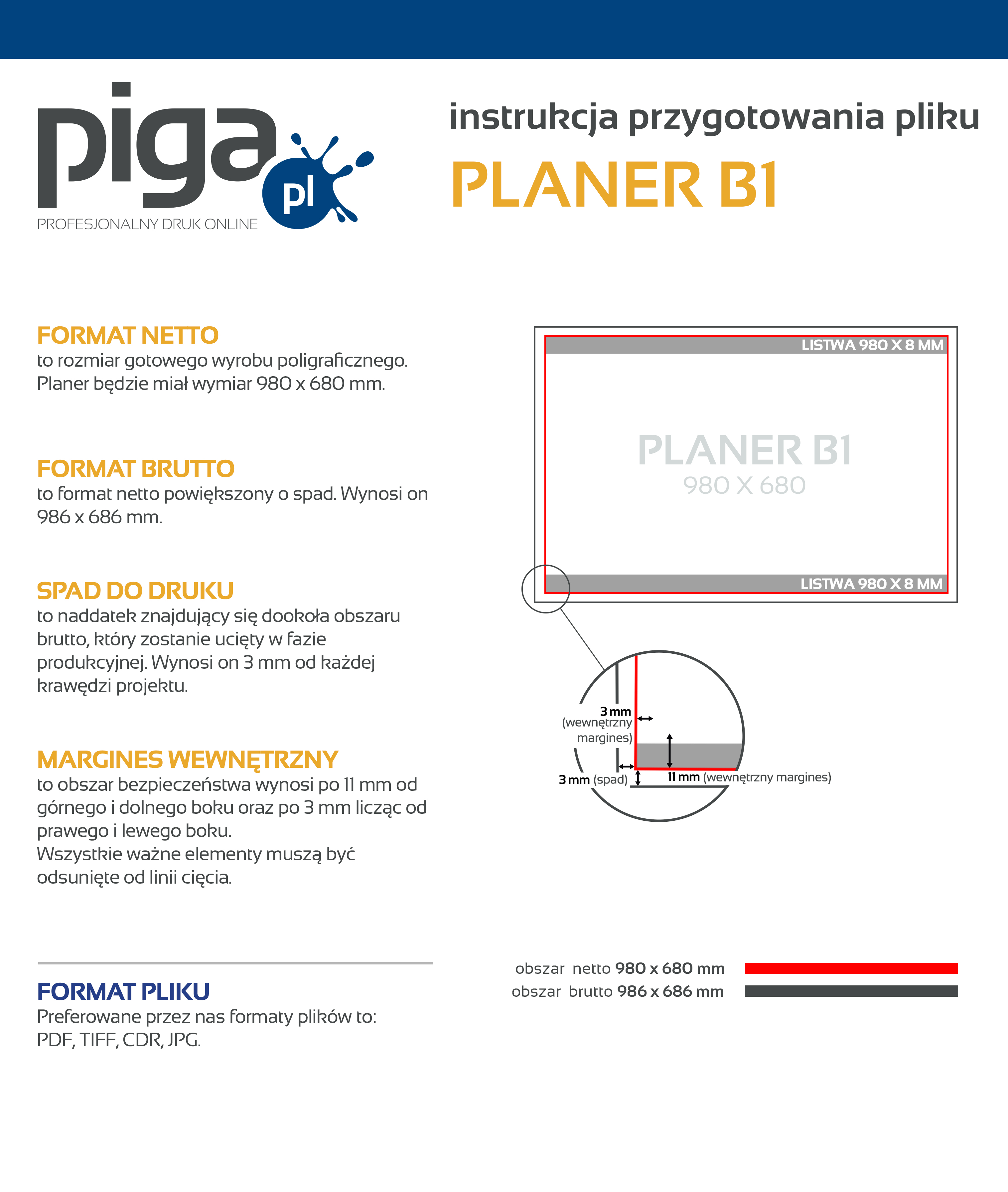 Preferowane przez nas formaty plików to PDF, TIFF oraz JPEG. Udostępniamy instrukcję przygotowania pliku oraz szablony/makiety dla poszczególnych programów graficznych, zapisując je na dysku otrzymujesz zwymiarowane pole robocze, w którym możesz zaprojektować swoją grafikę. Kliknij w ikonkę i ściągnij plik.