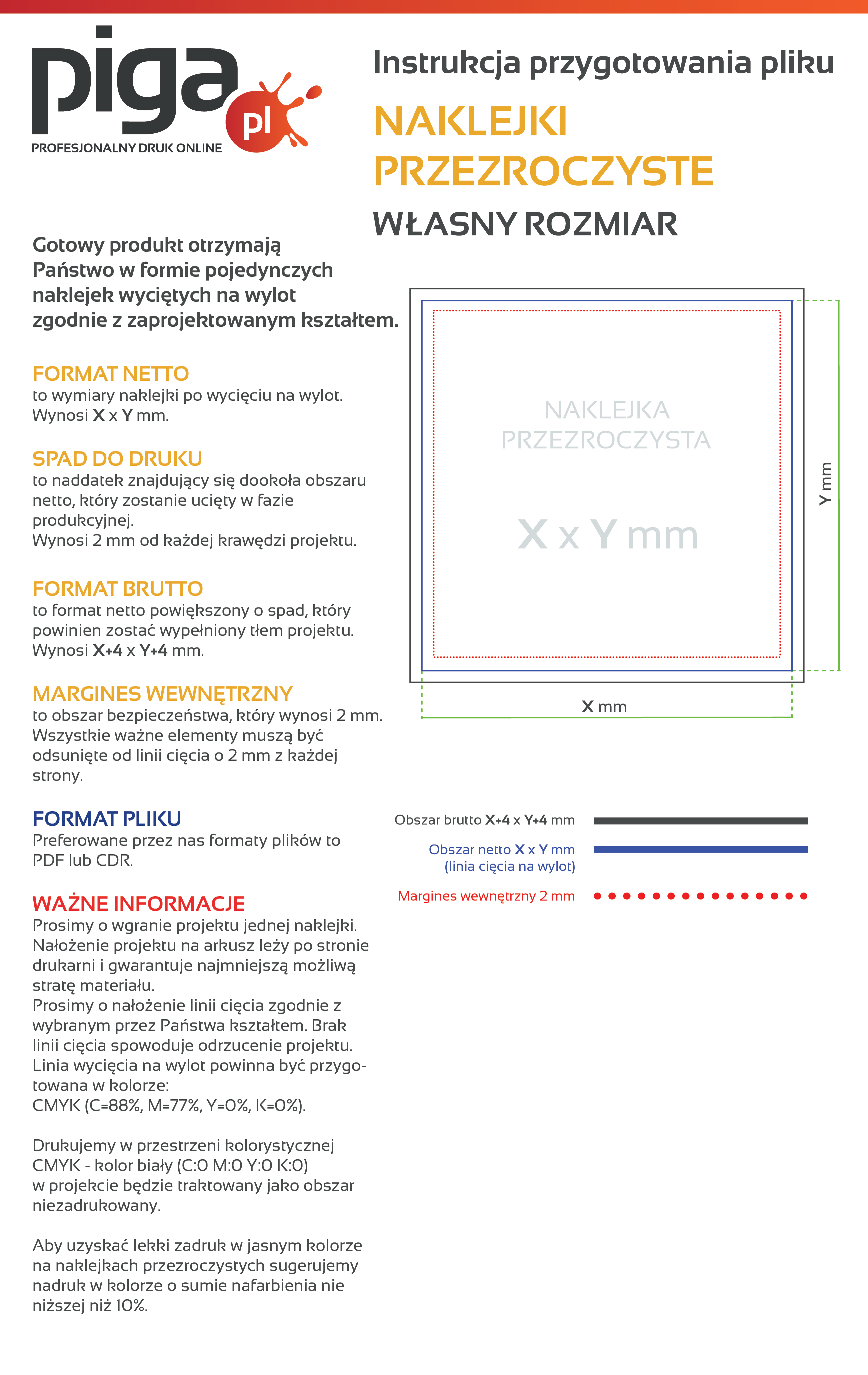 Preferowane przez nas formaty plików to PDF, TIFF oraz JPEG. Udostępniamy instrukcję przygotowania pliku oraz szablony/makiety dla poszczególnych programów graficznych, zapisując je na dysku otrzymujesz zwymiarowane pole robocze, w którym możesz zaprojektować swoją grafikę. Kliknij w ikonkę i ściągnij plik.