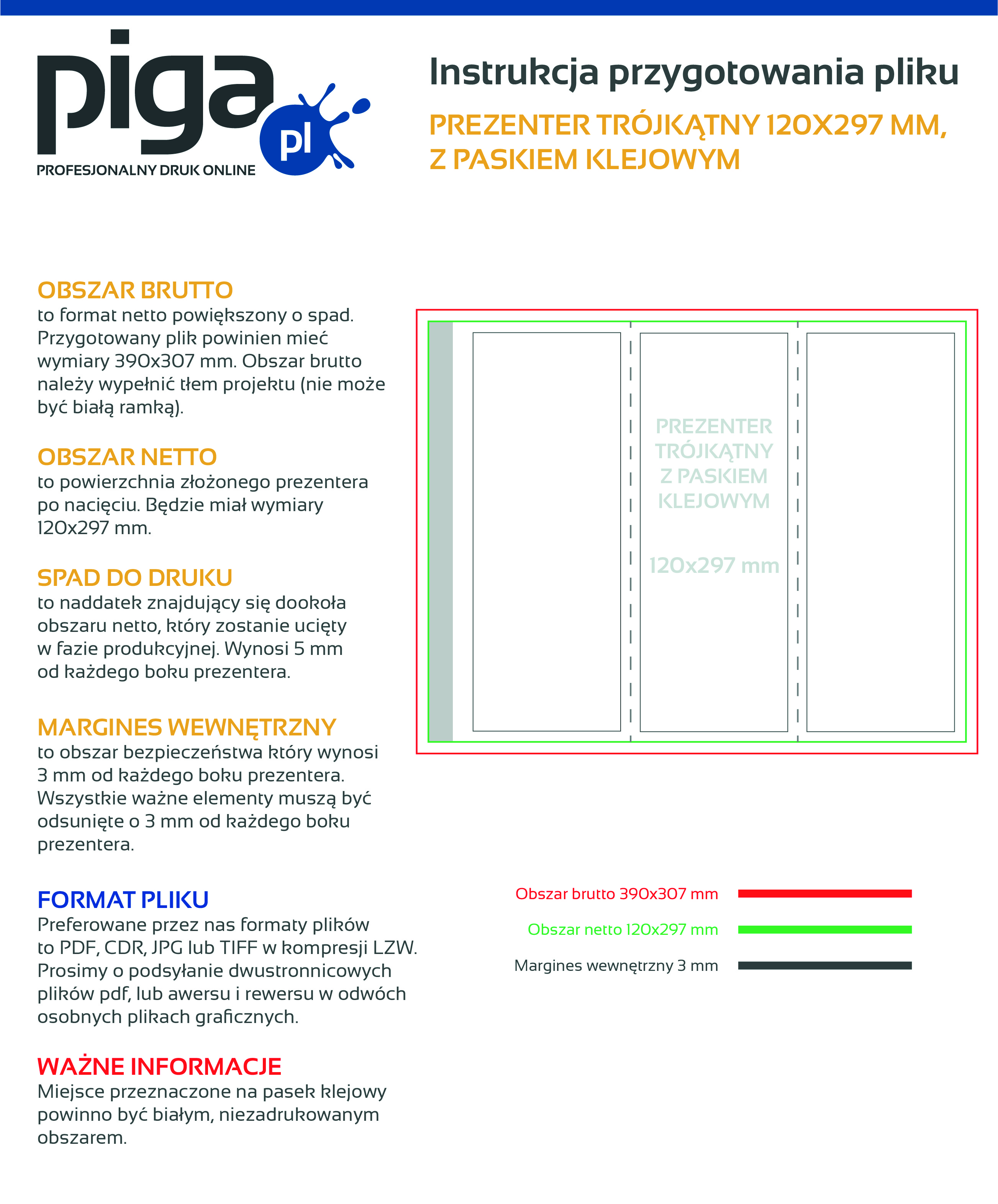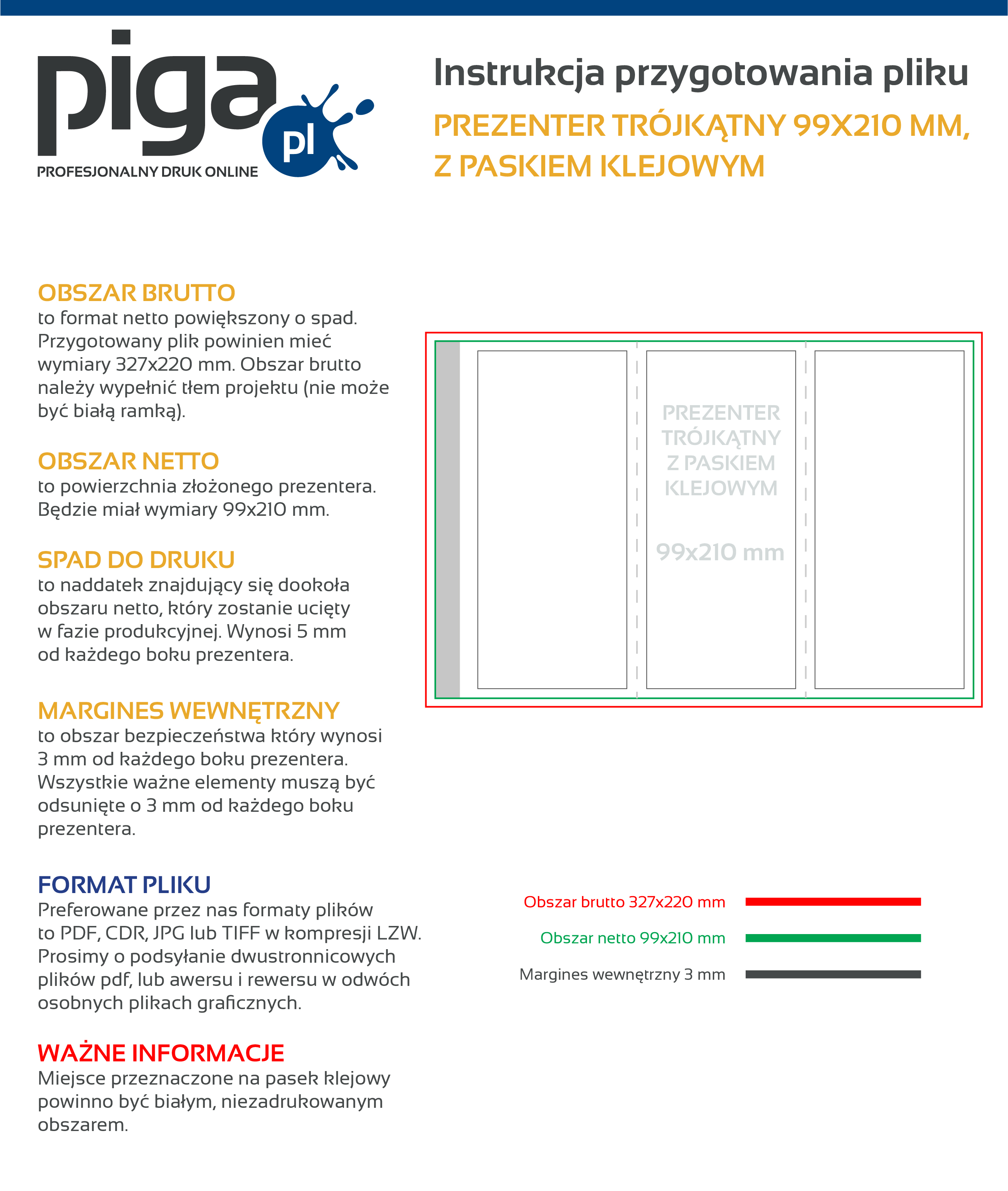 Zarówno prezentery trójkątne z paskiem klejowym, jak i te, w których stosowany jest zamek bezklejowy, drukujemy na 300 g papierze w dwóch formatach – mniejszy ma rozmiar 99 x 210 mm, a większy - 120 x 297 mm. Każdy z rodzajów prezenterów trójkątnych, niezależnie od rozmiaru oraz metody składania, może zostać dodatkowo uszlachetniony folią matową lub błyszczącą. Foliowanie to wykończenie, które dodatkowo pełni funkcję ochrony kartonu, z którego zostały wykonane prezentery trójkątne. Naniesiona folia chroni karton m.in. przed zalaniem, a dodatkowo podkreśla jakość wykonanych prezenterów. Warto pamiętać, że wykorzystujemy nowoczesny park maszynowy, w którym druk wykonujemy nowoczesną technologię druku cyfrowego bądź offsetowego. Efektem są żywe kolory wydruku oraz wyrazisty i czytelny druk, które doskonale podkreślą przekaz marketingowy, jaki chcesz zakomunikować swoim klientom. Zatem projektuj (przy okazji pamiętaj, że prezenter może leżeć na jednym boku lub być ustawiony w pionie), drukuj, i ciesz się efektami.