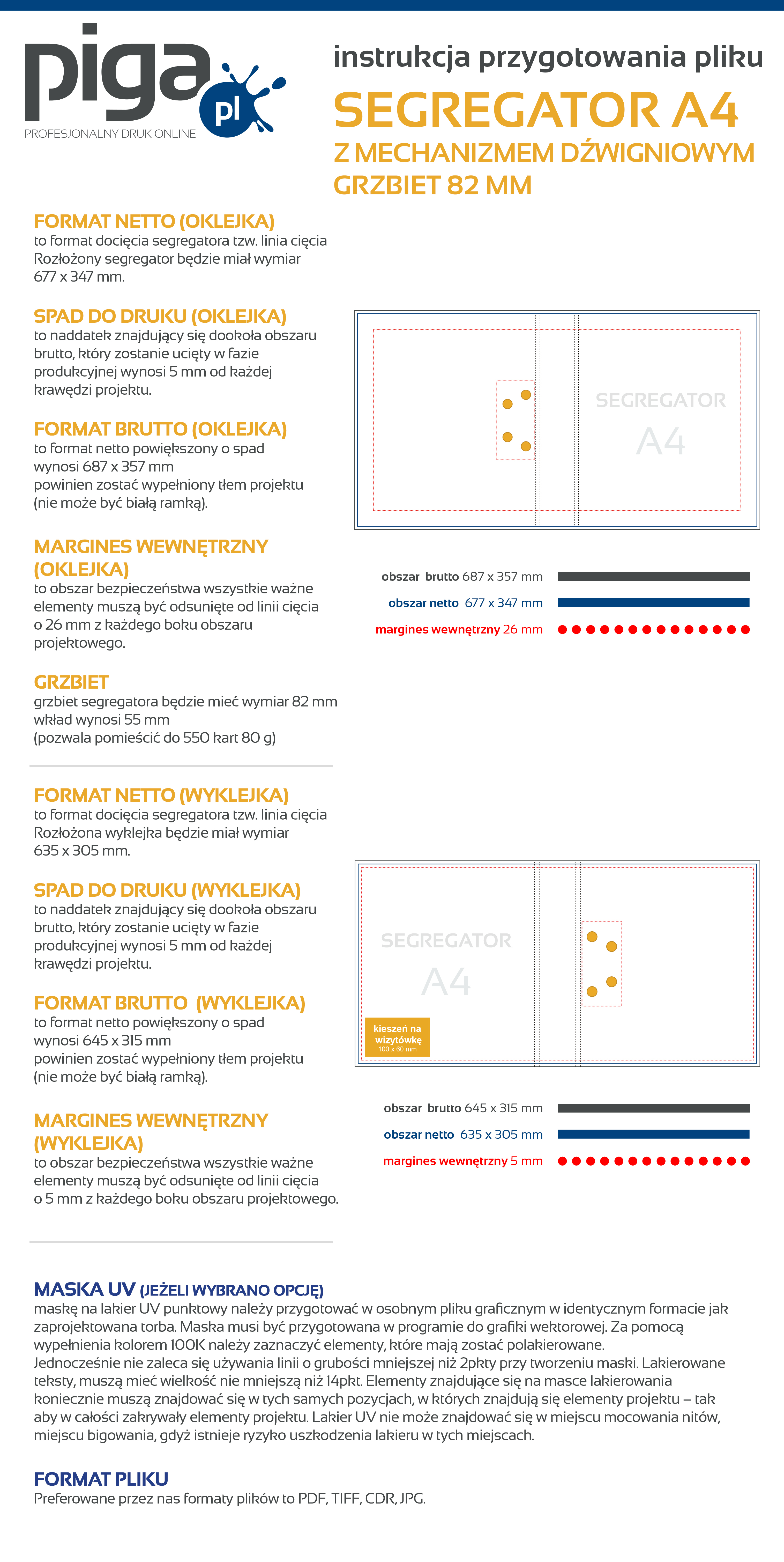 Preferowane przez nas formaty plików to PDF, TIFF oraz JPEG. Udostępniamy instrukcję przygotowania pliku oraz szablony/makiety dla poszczególnych programów graficznych, zapisując je na dysku otrzymujesz zwymiarowane pole robocze, w którym możesz zaprojektować swoją grafikę. Kliknij w ikonkę i ściągnij plik.
